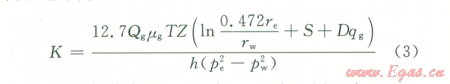 式中Qg為氣井產量,104 m3/d;pe為地層壓力,MPa;pw為氣井生產時井底流壓,MPa;T為氣層溫度,K;µg為氣體的地下黏度,mPa·s;Z為氣體的偏差系數;h為有效厚度,m;re為泄流半徑,m;rw為井眼半徑,m;K為氣層滲透率,mD。這里討論的是氣體流動的最小滲透率值,故可以將井看作為完善井,即設S和Dqg等于0。