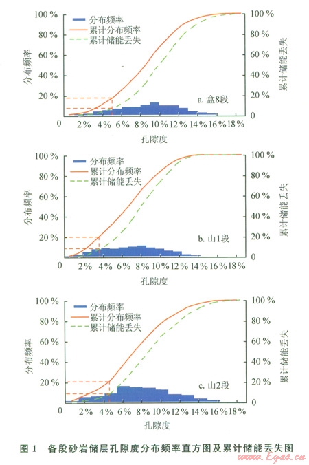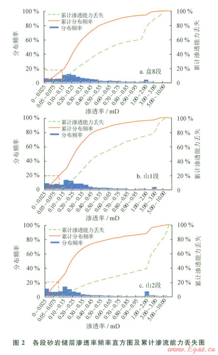 經對蘇東地區盒8段、山1段、山2段的物性特征、巖性特征和孔隙結構特征分析,認為該區儲層為典型的中低孔-低孔、低滲-特低滲儲層。孔隙度為5%~l5%,滲透率為0.1~1.0 mD,滲透率能力較差。按照經驗統計法(圖1、2),考慮到長慶油田低孔、低滲的儲層特點,按照累計頻率丟失不超過總累計的20%,累計儲能、產能丟失不超過總累計的l0%。當