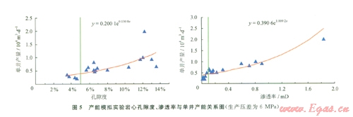 本次研究根據產能模擬實驗結果見圖5。由實驗結果可知:隨著生產壓差的逐漸增大,產能模擬實驗得到的單井日產量逐漸增加。儲層孔隙度、滲透率等物性越好的氣層,單井日產量越高,兩者之間呈正相關關系。因此,根據室內產能模擬實驗結果可以確定,在目前蘇東地區天然氣井常用生產壓差6 MPa條件下,氣層孔隙度大于5%、滲透率大于0.10 mD時,則氣井單井產量可以達到蘇東地區工業氣流0.3 X 104 m3/d的標準。