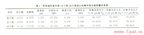 根據蘇東地區儲層物性,擁有70%以上可供油氣通過的喉道及其所控制的孔隙空間體積為基質產氣提供條件,這時所對應的孔喉半徑值作為最小流動孔喉半徑[7]。根據蘇東地區氣藏樣品壓汞資料分析(表1),可得出以下結論:盒8段、山1段最小流動孔喉半徑定為0.05µm,山2段最小流動孔喉半徑定為0.02 µm。