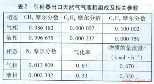 初始運行時,原料氣冷卻所需冷量由外加制冷劑提供。當換熱器3出口的天然氣溫度達到203.15 K時,天然氣從拉法爾噴管噴出并進入引射器,由于沒有被引射氣體,故此刻僅以原料氣組分從引射器出口流出,控制其出口溫度使之在1.2 MPa壓力下的氣化率為0.67。通過比較計算結果和實驗結果,可得出用SRK方程計算烴類混合物的氣液相平衡是可靠的H 3,本文選用SRK方程計算天然氣氣液相的相平衡。利用ASPEN.HYSYS7.2計算得前述天然氣組成,并且得出引射器出口溫度為152·43 K。引射器出口天然氣氣液相組成及相關參數見表2。
