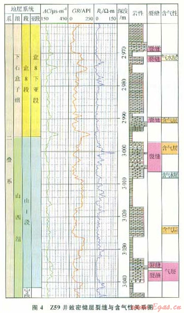 低滲透砂巖油氣藏滲流起主導作用的為宏觀裂縫系統,而微觀裂縫主要是改善儲層的滲透性能。裂縫是低滲透砂巖儲層的主要滲流通道,控制了油氣藏的滲流系統[6]。研究區占主導地位的是構造裂縫,裂縫是極好的運移通道,是溝通孔洞、形成優質儲層的重要因素,對天然氣聚集成藏的重要影響。在裂縫較為發育的地區或層段,尤其是對低孔、低滲的砂巖儲層而言,裂縫發育的層段,砂巖含氣性明顯好于一般的砂巖儲層,氣層、含氣層基本對應于裂縫發育井段(圖4)。表明裂縫對儲層物性具有明顯的改善作用,是形成高產氣藏的重要條件。