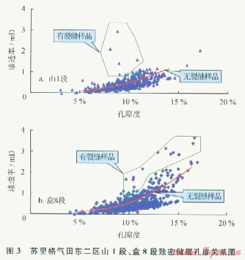 裂縫所形成的孔隙度占巖石體積的1%~2%,雖然構成的儲集空間很小,對孔隙度的影響不大,但由于裂縫的存在,連通了孤立狀存在的孔隙,形成了砂巖的滲濾通道,提高了巖石的滲透率,對儲層的物性有明顯的改善作用。一般無裂縫發育的樣品,其孔隙度與滲透率呈現較好的線性正相關關系;而裂縫發育的樣品,其孔隙度并不一定很高,但滲透率明顯高于無裂縫樣品,滲透率值的分布脫離正??诐B線性關系(圖3)。裂縫的規模越大,其滲透率增加的幅度越大。在低滲透儲層中,裂縫是油氣運移和流體滲流的主要通道,可以提高儲層的滲透性,裂縫的存在可使儲層滲透率比基質滲透率增高1~2個數量級,并使其水平滲透率各向異性在50∶1以上[5]。