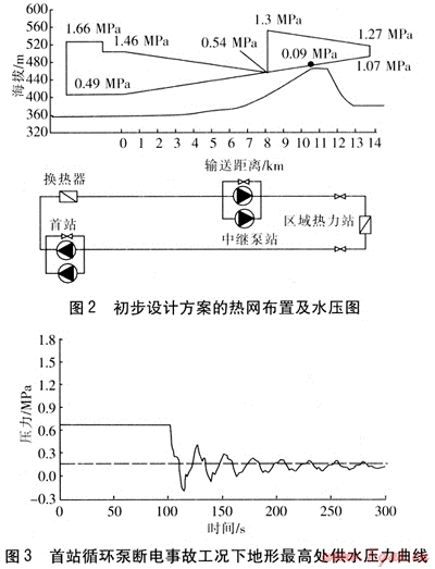 初步設計方案考慮控制輸送干線運行壓力在1.6MPa以下,在中部設中繼泵站一座,初步設計方案的熱網布置及水壓圖見圖2。