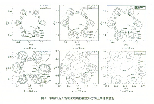 圖4給出了帶噴口角無焰氧化燃燒器溫度沿燃燒器軸線方向的變化情況。從圖4a可看出,燃燒器區(qū)域的最高溫度1 700 K位于空氣射流的某個(gè)半徑處,這表示空氣射流卷吸其附近的天然氣和燃燒產(chǎn)物使氧化劑、燃料和產(chǎn)物的比例在該空氣射流半徑處達(dá)到最佳的狀態(tài)。燃燒首先在那里發(fā)生,朝空氣射流中心的周圍擴(kuò)散。當(dāng)流動(dòng)進(jìn)一步向下游推進(jìn)時(shí),燃燒強(qiáng)度進(jìn)一步增加,溫度逐漸上升,最高溫度大約出現(xiàn)在z=100 mm處。在z=100mm之后,由于燃料大部分被燃燒,溫度又開始逐漸降低,并且由于混合更充分,溫度也變得更均勻。另外,由于噴嘴沿軸心具有向外的傾角,沿著軸線方向射流問的間隔也變得越大(即從射流整體運(yùn)動(dòng)來看,它像一個(gè)圓錐擴(kuò)展運(yùn)動(dòng),因此沿著石方向,即圓錐軸線方向,在圓錐橫截面上的各分射流間隔越來越大),在空氣射流和燃料射流混合之前,它們更充分地被燃燒產(chǎn)物所稀釋,燃燒區(qū)域更大,因此最高溫度也較低。