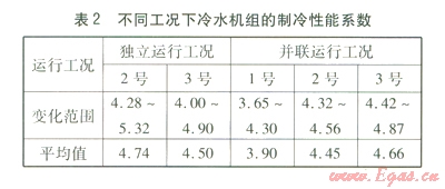 由表2可知,單臺機組運行時,機組的制冷性能系數(shù)較高,均大于4.0。當兩臺機組并聯(lián)運行時,l號機組的制冷性能系數(shù)較低。分析冷水機組性能曲線發(fā)現(xiàn),當大小兩臺冷水機組負荷分配比例接近3:2時,兩臺機組的總運行功率較小,處于節(jié)能狀態(tài)。在制冷工況下,冷水系統(tǒng)輸送能效比的平均值為0.026 3,比GB 50189--2005《公共建筑節(jié)能設計標準》規(guī)定的限值0.024 1偏大一些,冷水系統(tǒng)處于不節(jié)能的運行狀態(tài)。