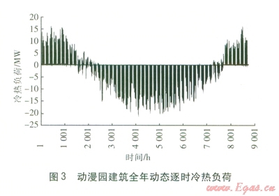 采用Energyplus模擬計(jì)算動漫園建筑全年動態(tài)逐時冷熱電負(fù)荷。全年動態(tài)逐時冷熱負(fù)荷見圖3,圖中正值為熱負(fù)荷,負(fù)值為冷負(fù)荷。由圖3可知,全年最大冷負(fù)荷為20 532.8 kW,最大熱負(fù)荷為15 987.3kW。建筑全年各時段用電負(fù)荷(不含空調(diào)系統(tǒng)用電負(fù)荷)比較均衡,全年最大用電負(fù)荷為6 883.5 kW。