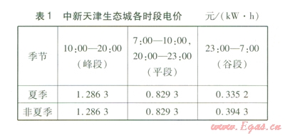 燃?xì)鈨r格按照2.4 元/m3計(jì)算,中新天津生態(tài)城各時段電價見表l。此外,燃?xì)廨啓C(jī)部分負(fù)荷率下降到0.5以下時熱效率下降嚴(yán)重,因此將燃?xì)廨啓C(jī)部分負(fù)荷率≥0.5作為約束條件。將以上參數(shù)輸入到優(yōu)化評價模型就可得到聯(lián)供系統(tǒng)的最優(yōu)設(shè)備配置和運(yùn)行策略。