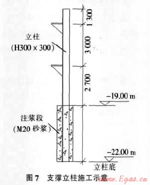 在封底旋噴樁施工完成后進行支撐立柱的施工。立柱采用300mm×300mm型鋼制作,引孔直徑500mm,底部-19~-22m段灌注M20水泥砂漿。支撐立柱施工見圖7。