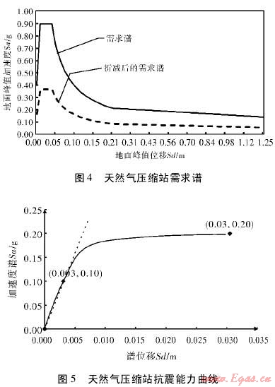 為了進一步得到該站抗震能力曲線。以圖2所示能力曲線為基本形狀,并依據HAZUS-MH對相關能力曲線參數進行設置。本例中屈服承載能力與極限承載能力兩個控制點相關參數設置如下:Cs為0.05,Te為0.35,α為0.75,γ為1.5,λ為2,μ為5。將以上參數代入能力譜控制點公式,得到該天然氣壓縮站抗震能力曲線如圖5所示。