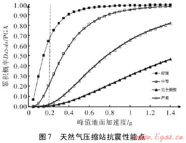 由于我國缺少燃氣壓縮站脆弱性曲線相關數據,這里依據HAZUS中建議采用相關參數,如表1所示,擬合出的天然氣壓縮站的脆弱性曲線,如圖7所示。