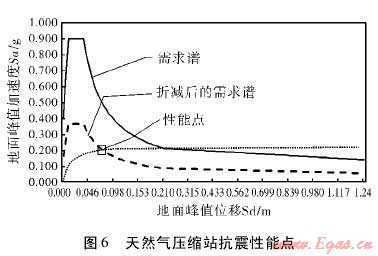 將天然氣壓縮站抗震能力曲線與需求譜繪制在同一坐標內,得到性能點,如圖6所示??梢钥闯?,性能點對應的地面峰值加速度約為0.2g,地面峰值加速度約為0.07m。該性能點反映了天然氣壓縮站在本次地震中所能承受的極限值。