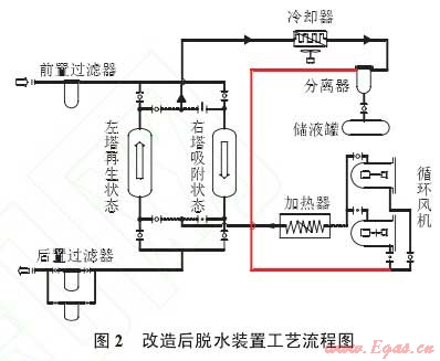 (2)脫水裝置雙塔閉式循環(huán)再生時,常因系統(tǒng)壓力超高使再生被迫停止,即使減壓再生,吸附塔與再生塔會相互污染,無法獲得理想的再生效果。