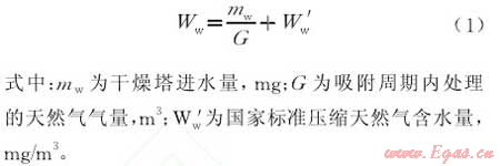 根據(jù)上述已知條件計算可得,在吸附周期(處理天然氣,使其含水量符合國家標(biāo)準(zhǔn)的連續(xù)工作時間)內(nèi),干燥塔最多可吸附45kg的水(分子篩動態(tài)吸附量為靜態(tài)吸附量的10%)。由式(1)可得,改造前工藝來氣含水量908mg/m3,改造后工藝來氣含水量53mg/m3。