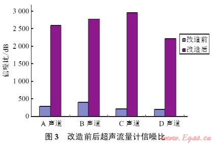 (3)由于在超聲流量計與調壓閥之間安裝了T形管件和90°彎頭,且工藝管道埋地后相當于增大了流量計與調壓閥之間的管道距離,干擾噪音明顯降低,超聲流量計運行狀況正常、穩定。利用Daniel CUI軟件對超聲流量計進行現場診斷后發現:超聲換能器信號質量均為100%,信噪比SNRs均超過2000(圖3)。
