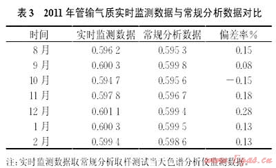 (2)在線色譜分析儀安裝投運后,為驗證該臺色譜儀實際運行效果,從2011年8月開始,對色譜儀氣質實時監測數據和常規取樣分析數據進行對比(表3)。從投運7個月的天然氣相對密度對比情況來看,實時監測數據與常規監測數據最大偏差出現在12月,為0.28%,其余月份偏差較小。除儀器固有分析誤差和常規分析時產生的泄漏等人為或器械故障原因導致出現不可克服的分析偏差外,色譜儀實時監測數據運行總體保持平穩。根據實時監測數據變動情況可知,10月初因下游用氣需求發生較大變化,期間壓減了某一氣源的日接氣量,導致相對密度變化較大。此時如果采用常規分析檢測手段將無法實時反映這種氣質變化,從而導致產生較大計量偏差。而安裝在線色譜儀后,可以實時采集到管道內的最新氣體組分,便于在上游進行流程切換時,及時掌握氣質變化情況,提高了計量精度[3]。