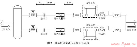 (3)采用超聲流量計計量時,應避免在流量計和調壓閥之間采用直通式的安裝結構。在場站安裝空間允許的情況下,可重點考慮計量、調壓分區設置,通過增大空間距離降低節流噪音對超聲流量計的影響;如果安裝空間受限,可考慮采用在超聲流量計后將工藝管道埋地敷設,設置埋地彎頭和T形管件的方式,減少到達流量計的節流噪音,確保精確計量[4]。