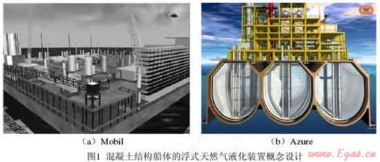 最初,FLNG 概念設計采用混凝土制造船體,在其上放置球形、圓柱形或薄膜型 LNG 儲艙。混凝土殼體吃水深,承載能力大,具有低溫性能好、不易老化的優點,但是這種結構的船身笨重,遷移和錨泊將是巨大的挑戰。代表性的 FLNG 概念設計有:Mobil 公司的 Floating LNG 和 Bouygues Offshore 公司的 Azure項目(圖1)。