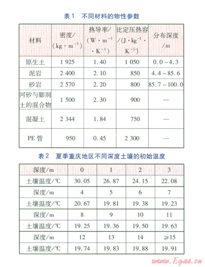 為了使數值計算結果更接近實際,考慮了土壤豎直方向的分層現(xiàn)象,根據重慶地區(qū)的現(xiàn)場勘測結果,沿土壤豎直方向依次為原生土、泥巖、砂巖。對于水平地埋管換熱器,回填材料為原生土。豎直地埋管換熱器鉆孔的回填材料為河砂與膨潤土的混合物。對于樁基螺旋地埋管換熱器,樁基內部為混凝土,外部為原生土。不同材料的物性參數見表l。由表l中原生土、泥巖、砂巖的分布深度可知,水平、樁基螺旋地埋管換熱器所在深度只涉及原生土,豎直地埋管換熱器所在深度涉及原生土、泥巖、砂巖。