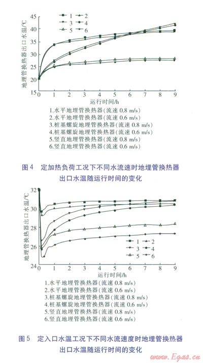 樁基螺旋地埋管換熱器的出口水溫隨時間升高得較快,主要原因為:樁基螺旋地埋管換熱器的螺距較小,相鄰地埋管相互影響,地埋管內傳熱介質的熱量只能向樁基外的土壤和樁基內的混凝土兩個方向傳遞,導致地埋管換熱器有效換熱面積減小,換熱性能下降。由圖4可知,在定加熱負荷工況下,流速對地埋管換熱器出口水溫影響較小。