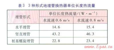 由于采取定入口水溫,不同形式地埋管換熱器單位長度(對于豎直地埋管換熱器為單位鉆孔長度)熱流量不同(見表3)。由表3可知,在運行時間內,3種地埋管換熱器中豎直埋管換熱器的單位長度熱流量最大。樁基螺旋地埋管換熱器的單位長度熱流量高于水平地埋管換熱器,但樁基螺旋地埋管換熱器的出口水溫在運行后期上升較快,可以推斷,隨著運行時間的進一步延長,這兩種地埋管換熱器單位長度熱流量的差距會逐漸縮小。