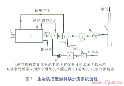 生物質(zhì)成型燃料鍋爐房系統(tǒng)流程見圖l。鍋爐房由鍋爐本體、燃料送料裝置、送引風機、軟水處理器、除塵器等組成。鍋爐房的燃料(生物質(zhì)成型燃料)、水、煙氣、空氣的流程與常規(guī)燃煤鏈條爐排鍋爐房近似。