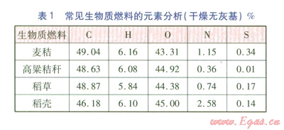 常見生物質(zhì)燃料的元素分析(干燥無灰基)見表1。由表1可知,生物質(zhì)燃料含碳量較少,質(zhì)量分數(shù)一般小于50%,因此生物質(zhì)燃料不耐燒,發(fā)熱量較低。生物質(zhì)燃料含硫量很低,質(zhì)量分數(shù)大多低于0.20%,甚至為零,因此燃用生物質(zhì)燃料的燃燒設(shè)備不必設(shè)置脫硫裝置,以降低設(shè)備造價。