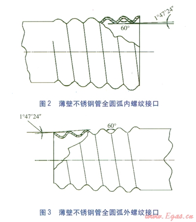 GB 50028-2006認可了薄壁不銹鋼管的卡套式連接,CJJ 94-2009認可了卡套式、卡壓式、環壓式3種機械連接。目前在燃氣行業中,卡壓式連接使用比較廣泛。GB/T l9228.1-2011《不銹鋼卡壓式管件組件》明確了卡壓式連接所應達到的技術性能,GB/T 3765-2008《卡套式管接頭技術條件》則明確了卡套式連接所需達到的技術條件。因此,我們認為,如果全圓弧螺紋接口的連接性能能夠達到卡壓式或卡套式連接的性能要求,則應該能夠在城鎮燃氣室內管道中應用。