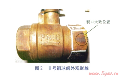 Ⅱ號銅球閥開裂形貌見圖2,裂口詳細位置及長度從外觀觀察并不明顯。該銅球閥在管道上運行時被查出圖2所示“裂口大致位置”處泄漏天然氣,后送研究部門沿該處進行線切割后發現閥體也沿軸向方向開裂。