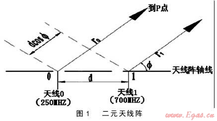 圖1為一個二元天線陣的示意圖,天線0同天線1均為偶極子天線,只是天線0為250MHz,天線1為700MHz。它們的取向(排列方向相同),兩天線間的距離為d,它們到觀察點p的距離分別為r0和r1,由于觀察點很遠,r0和r1可看成平行。在計算兩天線到p點的相位差時,可近似令r0≈r1,但計算兩天線到P點的相位時,應采用較為準確的關系式r1=r0-dcosφ,當兩天線電流大小和相位關系為I1=mI0e-ja時(m與a為常數(shù)),天線1的輻射波在到達p點時將較天線0的輻射波超前相位φ=kdcosφ-a,等式右邊第一項是由兩天線的相對位置引起的;第二項是由兩天線電流的相對相位引起的。φ是天線陣由天線0到天線1(由電流超前引向電流滯后)的軸線沿著逆時針方向旋轉到指向觀察點的射線夾角。如果天線0在p點產(chǎn)生的場強是E0,則由于電場強度正比于電流的一次方,故天線1在p點產(chǎn)生的場強應為E1=mE0ejφ,于是合成場強是E=E0+E1=E0(1+mjφ)可以看到,合成電場是由兩部分相乘求得的,第一個因子E0是天線0單獨產(chǎn)生于p點的場強,由天線0的類型(更確切的就是它的電流分布)決定;第二個因子(1+mejφ)只依兩天線之間電流比值和它們相互位置而定,與天線類型無關,這一因子稱為陣因子。因此,由相同兩天線構成的天線陣,它的合成方向圖是單獨一付天線的方向圖乘上因子。