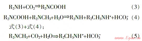 混合胺溶劑可以彌補大量脫除CO2時MDEA溶液的不足。純MDEA溶液與CO2不發生反應,但其水溶液與CO2可按式(1)~(2)反應:
