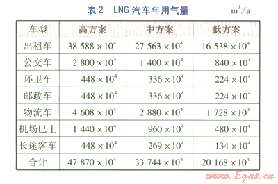 根據各類LNG車輛潛在用戶的特點,對各類LNG汽車發展數量及年用氣量進行了高、中、低3種方案的預測,分別見表1、2。