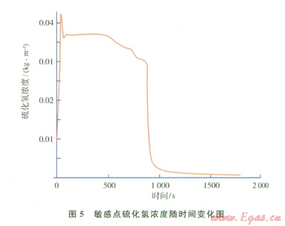 對于含硫天然氣擴散引起的風險,需要計算特定位置硫化氫含量的變化情況,即各網格點或敏感目標處硫化氫含量隨時間變化情況。分別以某井場井噴和某天然氣凈化裝置事故為例,得到事故發生時硫化氫的時空分布情況(圖2~5)。