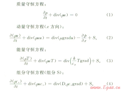 CFD可以看作是在流動基本方程(質量守恒方程、動量守恒方程、能量守恒方程)控制下對流動數值的模擬。通過這種數值模擬,可以得到極其復雜問題的流場內各個位置上基本物理量(如速度、壓力、溫度、濃度等)的分布,以及這些物理量隨時間的變化情況。由于含硫天然氣是混合物質,因此,控制方程還應包括組分守恒方程。4個方程的表達式如下。