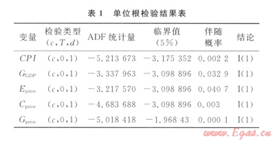 表1中,檢驗(yàn)類型(c,T,d)分別代表所檢驗(yàn)的序列中含有截距、時(shí)間趨勢以及滯后階數(shù);按AIC準(zhǔn)則確定滯后階數(shù)。結(jié)果表明,CPI、GGDP、Eprice、Cprice、Gprice的水平值都是非平穩(wěn)的,但其一階差分是平穩(wěn)的(ADF檢驗(yàn)即增廣迪基-福勒檢驗(yàn),其統(tǒng)計(jì)量的絕對(duì)值大于臨界值的絕對(duì)值,表示變量平穩(wěn)),因此,這5個(gè)變量序列都是在95%置信水平下的一階單整序列[表