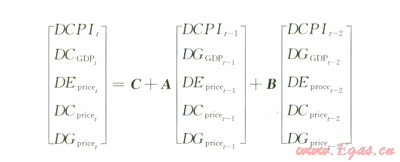 依據(jù)上節(jié)選定的變量DCPI、DGGDP、DEprice、DCprice、DGprice構(gòu)建5維向量自回歸模型。通過模型滯后結(jié)構(gòu)確定準(zhǔn)則,判定VAR模型的滯后期為2,建立VAR(2)模型如下: