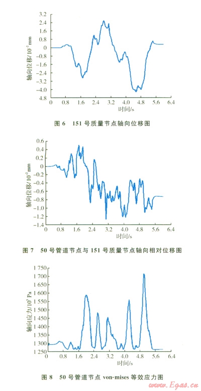 圖8顯示了管道50號節點von-mises等效應力在整個爆破地震波作用周期內的變化趨勢,在第4.8 s時管道中間節點應力達到170 MPa,仍然處于彈性階段。由于描述地震破壞作用的主要參數是軸向應變,而此算例的軸向應變最大值為0.0011,與采用抗震規范法中計算出的最大軸向應變為0.001 3極為接近,也證明了模擬結果的準確性。