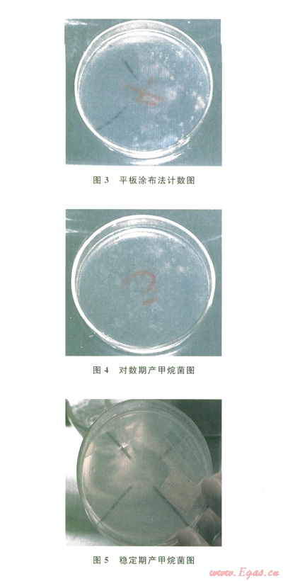 從接種培養(yǎng)的結(jié)果可以看出,細(xì)菌的生長個(gè)數(shù)與氧化還原電位有一定的關(guān)系,在高氧化還原電位時(shí)產(chǎn)甲烷菌的數(shù)量較少,隨著氧化還原電位的降低,基本趨勢(shì)是細(xì)菌生長的個(gè)數(shù)越來越多。由此認(rèn)為,氧化還原電位是產(chǎn)甲烷發(fā)酵的重要限制因子,較低的適合的氧化還原電位可以促進(jìn)產(chǎn)甲烷菌體內(nèi)的酶系的活性,使其調(diào)整代謝方式和速率,加快生長繁殖。另對(duì)-284mV的氧化還原電位值的產(chǎn)甲烷菌進(jìn)行為期90d的培養(yǎng)觀察,菌種的平板培養(yǎng)結(jié)果如圖3~5所示。