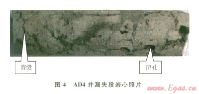 塔河油田l2區探井AD4井,處于構造洼地,AD4井南面發育有東西向斷裂,東面發育有南北向斷裂。地震資料顯示井區T47界面附近有強振幅“串珠狀”異常反射(圖3)。振幅變化率處理成果統計分析表現為強振幅變化率,相干屬性為較弱相干。鄰井鉆井完井資料顯示,7 口井中有2口在奧陶系一問房組發生漏失(其中TKl013井共漏失鉆井液