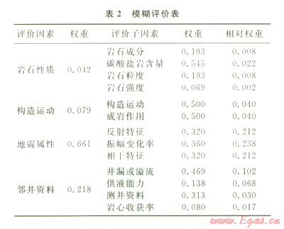 對縫洞型碳酸鹽巖地層,判斷漏失通道的發育及連通性是判斷井漏的基礎[1-8]。針對漏失通道的復雜性和隨機性,將井漏中地質因素中的各影響因素及對漏失通道判斷較敏感的地震屬性等進行分層,用工程模糊數學的指標隸屬度刻畫方法,建立易量化指標的隸屬度函數,運用主觀經驗判斷法、專家調查法(1~9標度法)、層次分析法來確定其中各個因素權重,采用加權合成得到最終的井漏評價值。從而有效指導鉆井方案的設計和優選[9-10]。