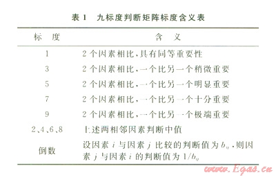 采用九標度法(表1),對每一結構層次內各因素兩兩比較其重要性,并把比較結果通過合適的標度表示出來,寫成矩陣形式,即為判斷矩陣。