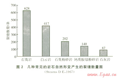 巖石在構造應力作用下會發生變形,當變形超過破裂強度時巖石將發生破碎,產生裂縫。不同的巖石在相同的應力作用下形變不同,產生的裂縫數也不相同,即強度決定巖石裂縫的多少(圖2)。