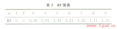 對于l~9階判斷矩陣,Saaty給出RI的值,見表3。
