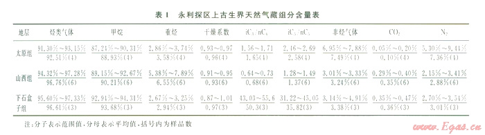 1)永利探區(qū)上古生界氣藏天然氣組分以烴類氣體為主,甲烷為烴類氣體的主要組分,其含量多超過90%,非烴氣體以氮?dú)鉃橹鳎瑯O少量為二氧化碳;氣藏的重?zé)N含量不高,干燥系數(shù)較高,氣藏總體上偏干,下石盒子組天然氣曾經(jīng)經(jīng)歷過較明顯的分餾作用。