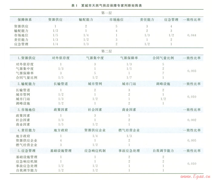 首先邀請天然氣行業l0余名專家針對天然氣供應保障評價指標體系內l8個評價指標逐一判斷其相對重要程度,構造判斷矩陣(表1)。