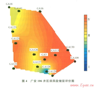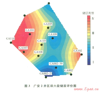 應用儲層評價方法對廣安2井區須六段儲層和廣安106井區須四段儲層進行了分類評價(圖3、4)。從圖中可以看出,廣安2井區須六段儲層中部南北向儲層為Ⅰ、Ⅱ類儲層;向東、西兩翼發展儲層逐漸變差,為Ⅲ、Ⅳ類儲層。因而,中部南北向為氣藏富集區,是氣藏開發的重點區域。廣安106井區須四段儲層整體為Ⅲ、Ⅳ類儲層,西北翼和南部儲層相對較好。