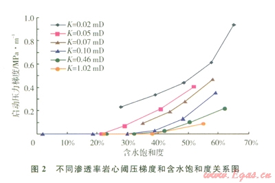 低滲透砂巖含水氣藏巖樣滲流實驗表明,當含水飽和度較高時,氣體滲流出現非達西流現象,存在閾壓梯度[8]。閾壓梯度與巖心滲透率及含水飽和度相關(圖2),巖心滲透率越低,含水飽和度越高,閾壓梯度越大。閾壓梯度可作為衡量儲層流動性強弱的指標,也是影響儲量動用程度的重要參數,因此,將閾壓梯度作為低滲含水儲層評價參數是必要的。