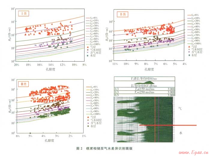常規和核磁共振測井結合是判別礁灘相儲層流體性質的最有效的方法。礁灘相儲層非均質性強,不同儲層物性對應的孔隙度膠結指數、飽和度指數有所差異,與此對應的氣水差異識別圖版也有所不同。因此,針對這些特征,以φ≥10%、φ=5%~l0%、φ=2%~5%作為礁灘相儲層Ⅰ、Ⅱ、Ⅲ類的物性分類標準,分別擬合了Ⅰ、Ⅱ、Ⅲ類儲層在不同飽和度下電阻率與孔隙度的氣水識別圖版(圖2),這些圖版是基于密閉取心分析的不同儲層物性的孔隙度膠結指數、飽和度指數的差異而建立的,其樣本點主要是YB地區長興組礁灘相儲層已經測試的電測數據。因此,依據Ⅰ、Ⅱ、Ⅲ類儲層氣水識別圖版,能準確判別出礁灘相儲層的流體性質。