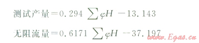 川東北YB地區長興組礁灘相儲層儲集空間主要以溶蝕孔洞型儲層為主,因此孔隙度對產能的控制起到關鍵作用,特別是φ介于5%~l0%的Ⅱ類儲層和φ≥10%的Ⅰ類儲層對產能的貢獻起主導作用。除孔隙度以外,儲層厚度也是控制產能的關鍵因素,由于元壩長興組氣層的含氣飽和度整體較高,不同物性的氣層飽和度差異較小。基于上述分析認為氣層孔隙度和有效厚度(限于Vsh≤l0%、φ≥2%、Sw≤20%)的乘積累加能直接反映出儲層的產能狀況,依據此,選取測試資料較為豐富的礁灘相氣層建立產能預測模型,為礁灘相儲層快速便捷地進行產能預測提供技術依據。表2為川東北YB地區礁灘相儲層參數及測試情況表,圖4-a為∑φH與測試產能之間的關系,圖4-b為∑φH與無阻流量之間的關系,從圖4中看出∑φH與兩者相關性較好,相關系數分別達到0.849和0.852。因此,認為YB地區長興組礁灘相儲層產能預測可采用如下模型:
