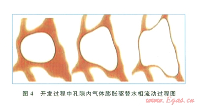 2)低滲透砂巖儲層氣水成互封狀態,衰竭式開發過程中,驅替壓力梯度大,氣體膨脹推動較大孔喉處及其控制的孔隙內水相成為可動水,是產水的主要原因。